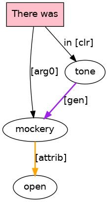 There[EX] was[BED;_ex_Vpr_] open[ADJ] mockery[N] in[P-ROLE] his[PRO;_genm_] tone[N] .[PUNC]