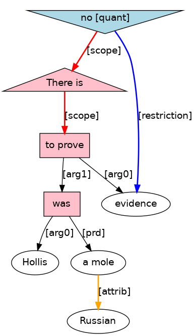There[EX] is[BEP;_ex_cat_Vt_] no[Q] evidence[N] to[TO] prove[VB;_Tf_] Hollis[NPR] was[BED;_Ln_] a[D] Russian[ADJ] mole[N] .[PUNC]