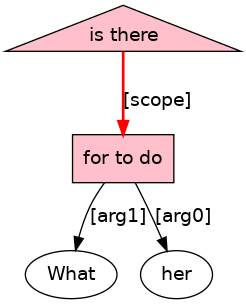 What[WPRO] is[BEP;_ex_cat_VtPASS_] there[EX] for[P-CONN] her[PRO] to[TO] do[DO;_Tn_] ?[PUNC]