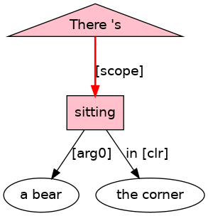 There[EX] <apos>s[BEP;_ex_cat_Vg_] a[D] bear[N] sitting[VAG;_Ipr_] in[P-ROLE] the[D] corner[N] .[PUNC]