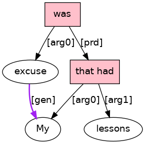 My[PRO;_genm_] excuse[N] was[BED;_equ_Vf_] that[C] I[PRO] had[HVD;_Tn_] lessons[NS] .[PUNC]