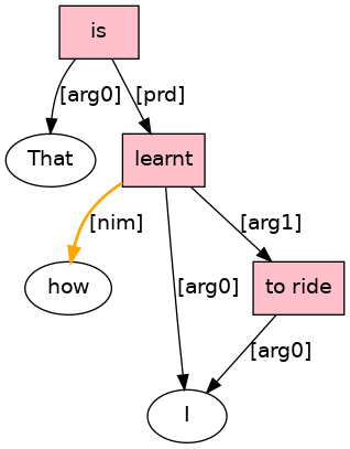That[D;_nphd_] is[BEP;_equ_Vw_] how[WADV] I[PRO] learnt[VBD;_Tt_] to[TO] ride[VB;_I_] .[PUNC]