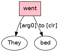 They[PRO] went[VBD;_Ipr_] to[P-ROLE] bed[N] .[PUNC]