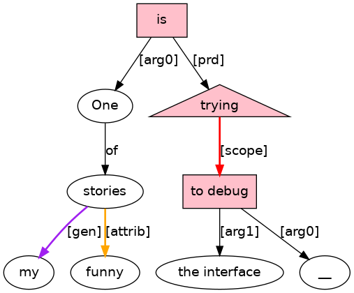 One[D;_nphd_] of[P-ROLE;_phrase_] my[PRO;_genm_] funny[ADJ] stories[NS] is[BEP;_equ_Vg_] trying[VAG;_cat_Vt_] to[TO] debug[VB;_Tn_] the[D] interface[N] .[PUNC]