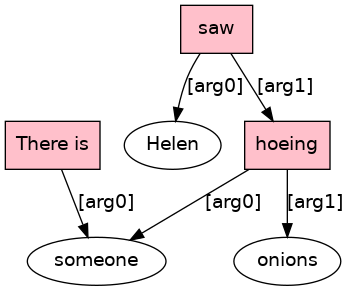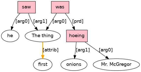 The[D] first[ADJ] thing[N] he[PRO] saw[VBD;_Tn_] was[BED;_equ_Vg_] Mr.[N] McGregor[NPR] hoeing[VAG;_Tn_] onions[NS] .[PUNC]