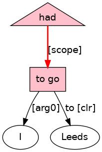 I[PRO] had[HVD;_cat_Vt_] to[TO] go[VB;_Ipr_] to[P-ROLE] Leeds[NPR] .[PUNC]
