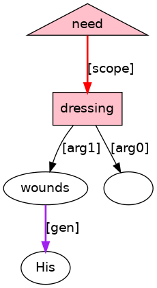 His[PRO;_genm_] wounds[NS] need[VBP;_cat_VgPASS_] dressing[VAG;_Tn_] .[PUNC]