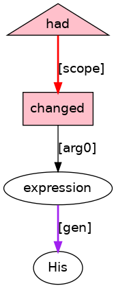 His[PRO;_genm_] expression[N] had[HVD;_cat_Ve_] changed[VVN;_I_] .[PUNC]