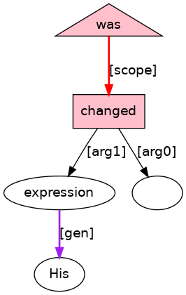His[PRO;_genm_] expression[N] was[BED;_cat_VePASS_] changed[VVN;_Tn_] .[PUNC]