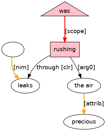 leaks[NS] through[P-ROLE] which[RPRO] the[D] precious[ADJ] air[N] was[BED;_cat_Vg_] rushing[VAG;_Ipr_]