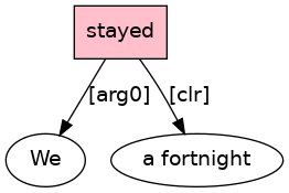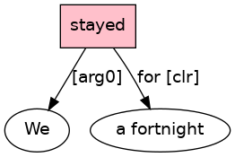 We[PRO] stayed[VBD;_In/pr_] for[P-ROLE] a[D] fortnight[N] .[PUNC]