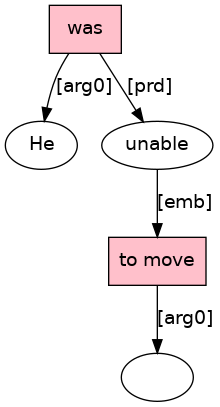 He[PRO] was[BED;_La_] unable[ADJ;_cat_] to[TO] move[VB;_I_] .[PUNC]